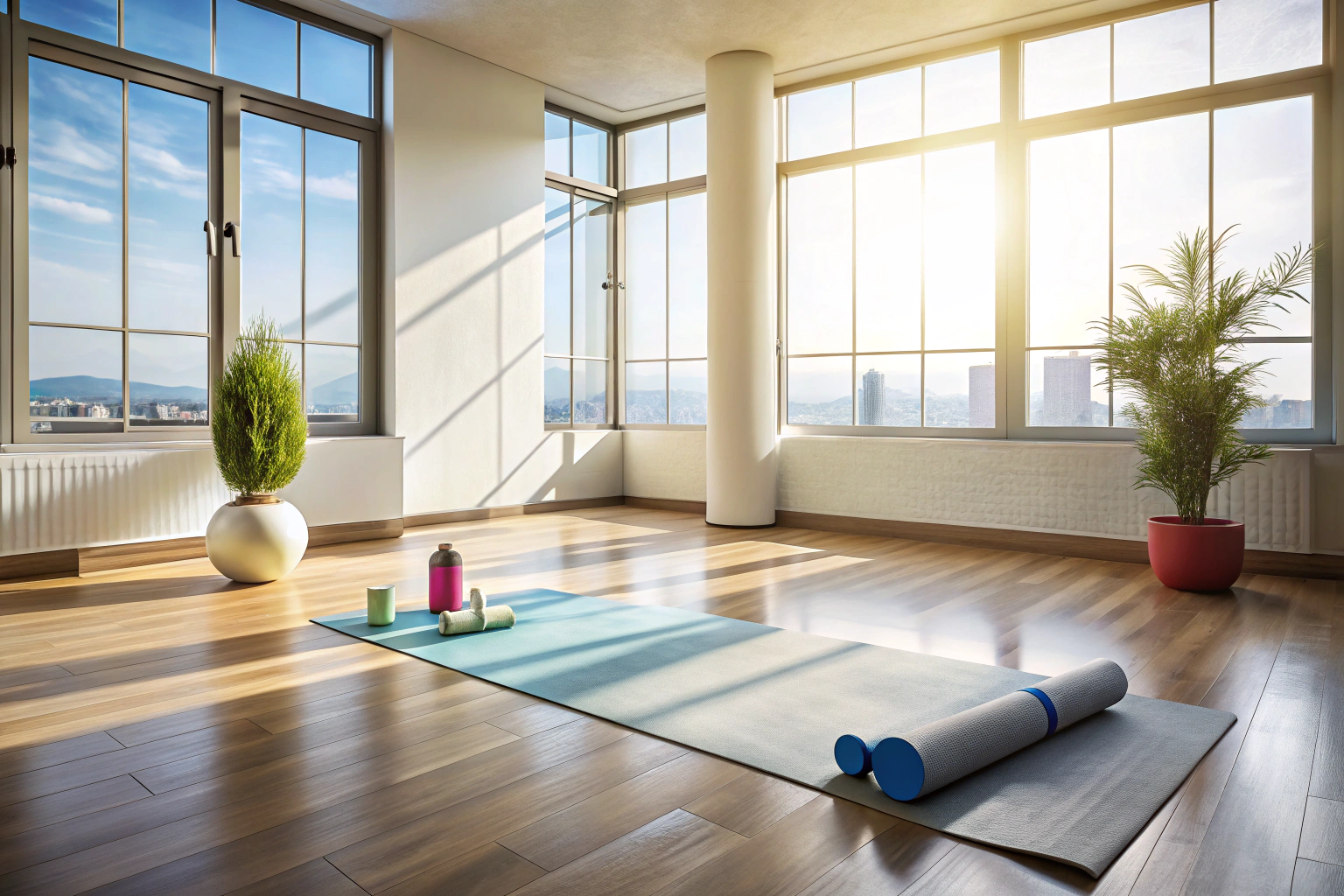Una esterilla de yoga colorida extendida en un suelo de madera clara, con un bloque de yoga y una correa colocados ordenadamente a un lado, iluminados por la luz natural de una habitación espaciosa